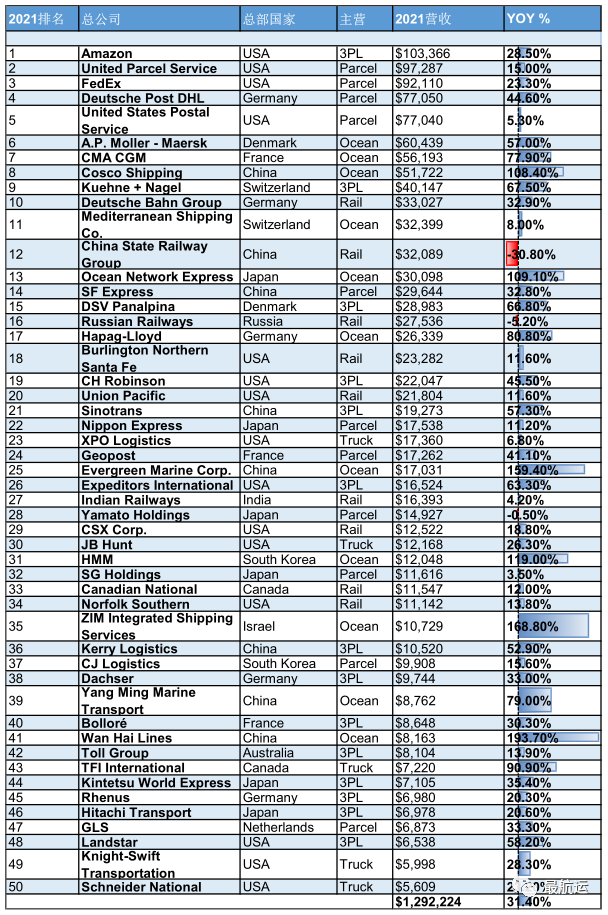 全球运输公司50强!(第三方物流,快递,船公司,铁路,车队)