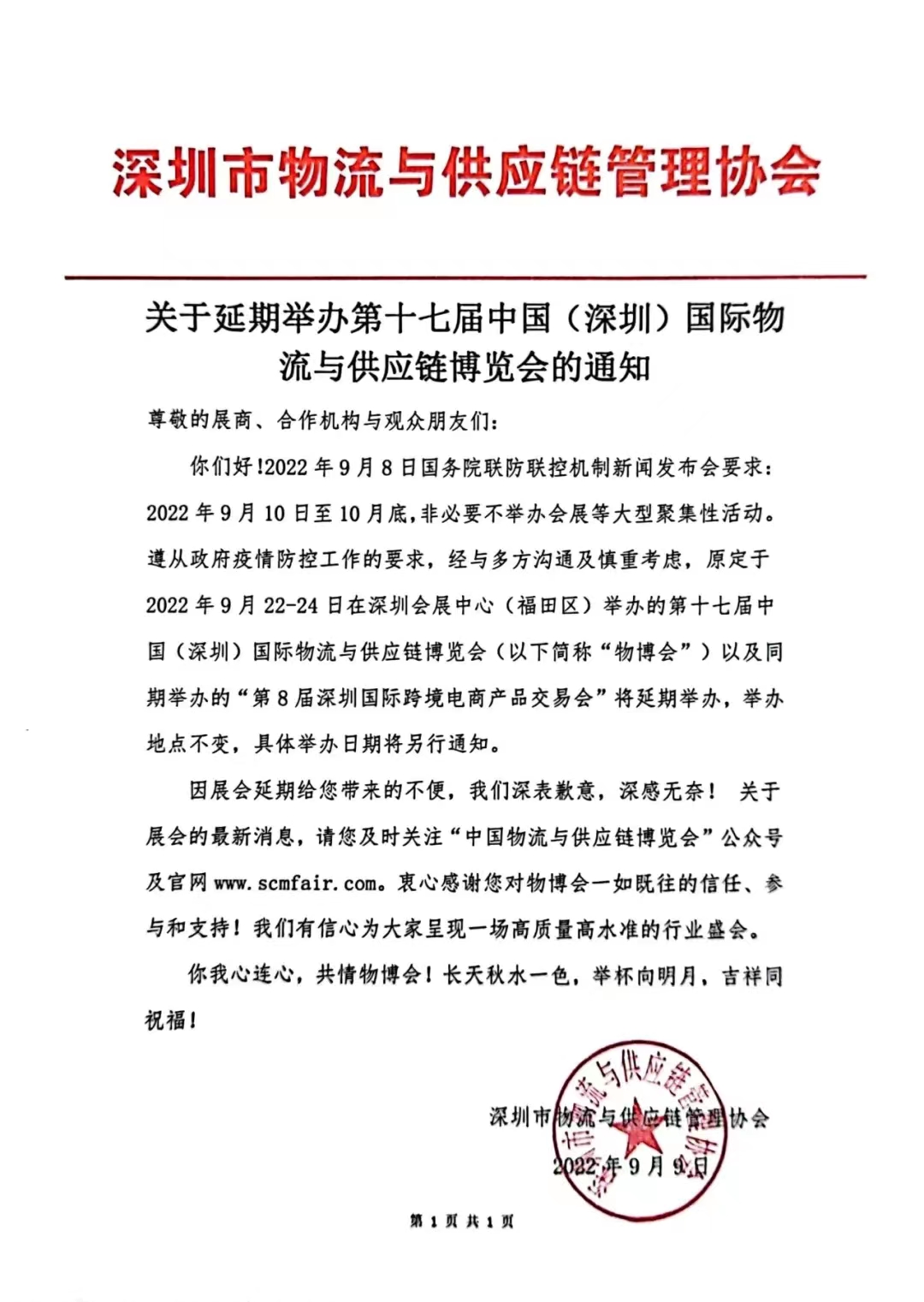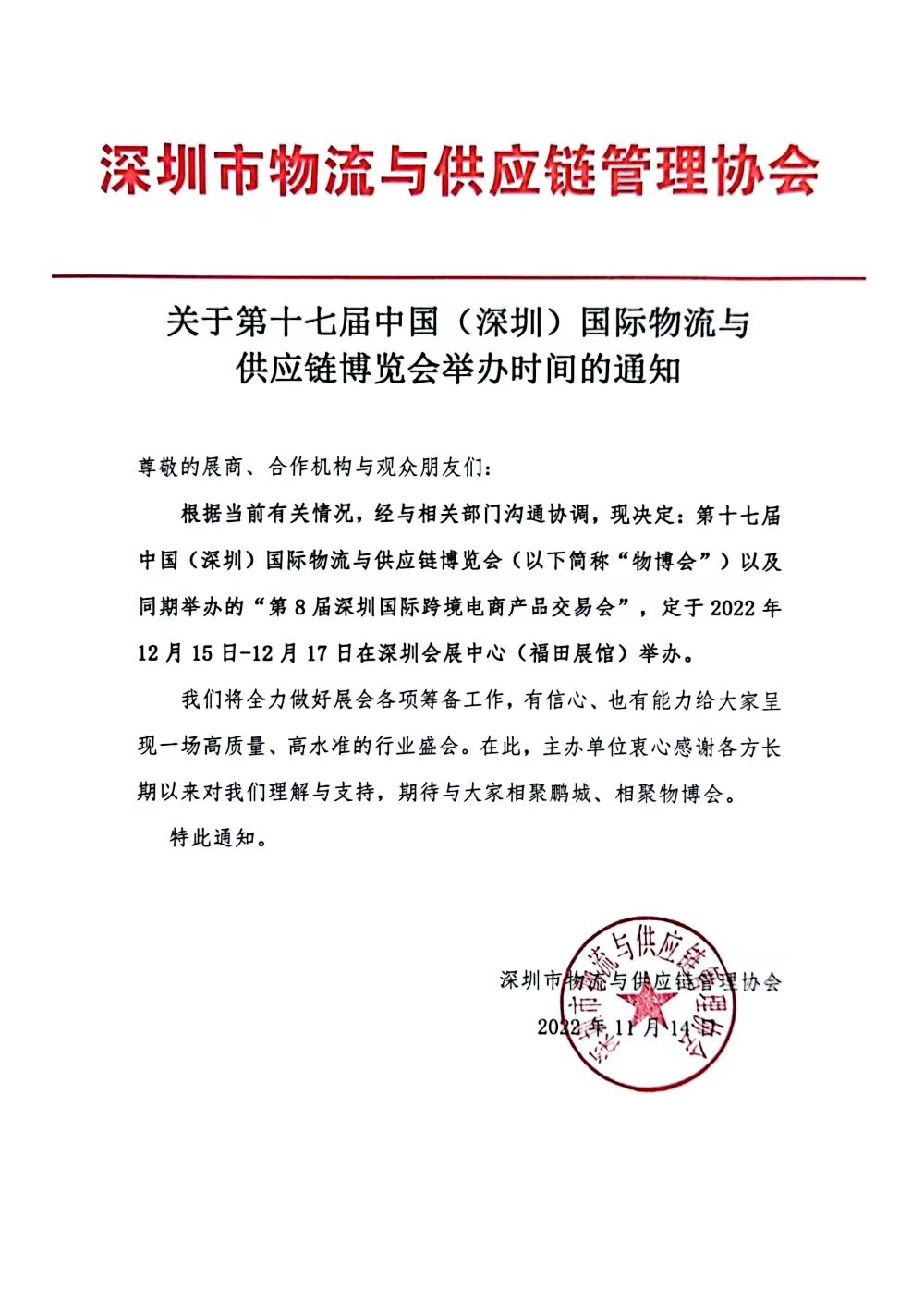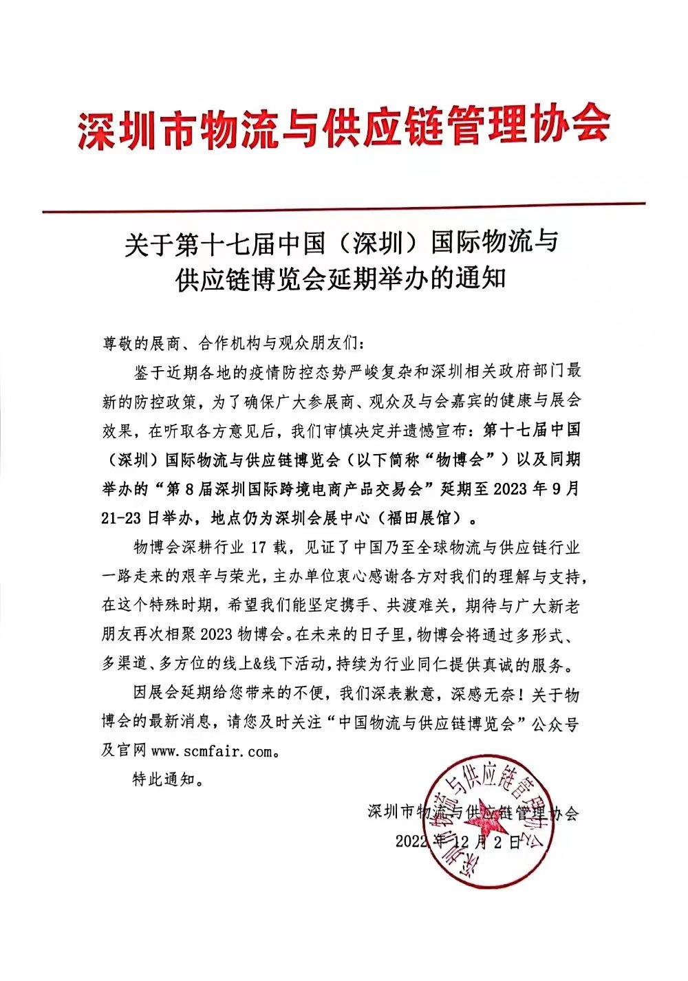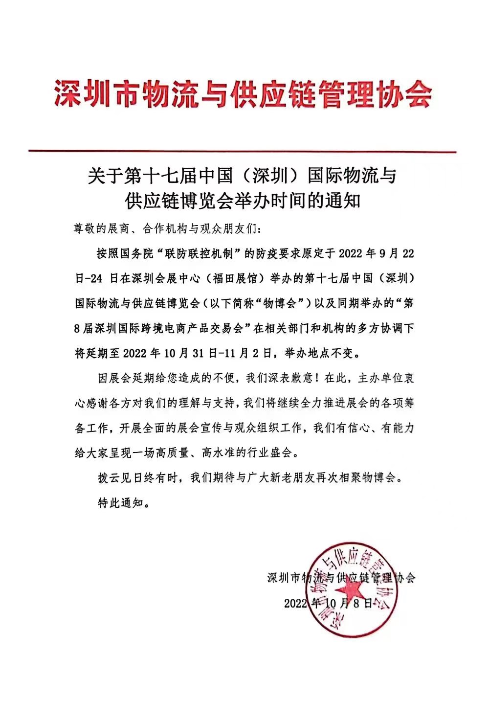关于第十七届中国(深圳)国际物流与供应链博览会延期举办的通知